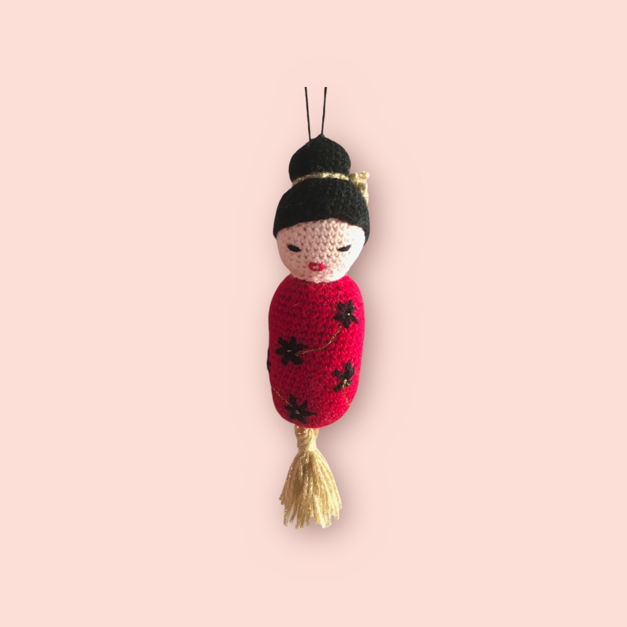 Inspirée de la tradition japonaise, cette poupée Kokeshi à suspendre apportera une touche zen et authentique à votre décoration. Confectionnée avec soin et amour, cette création artisanale de 22 cm de hauteur est un véritable porte-bonheur.